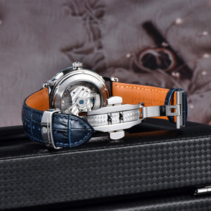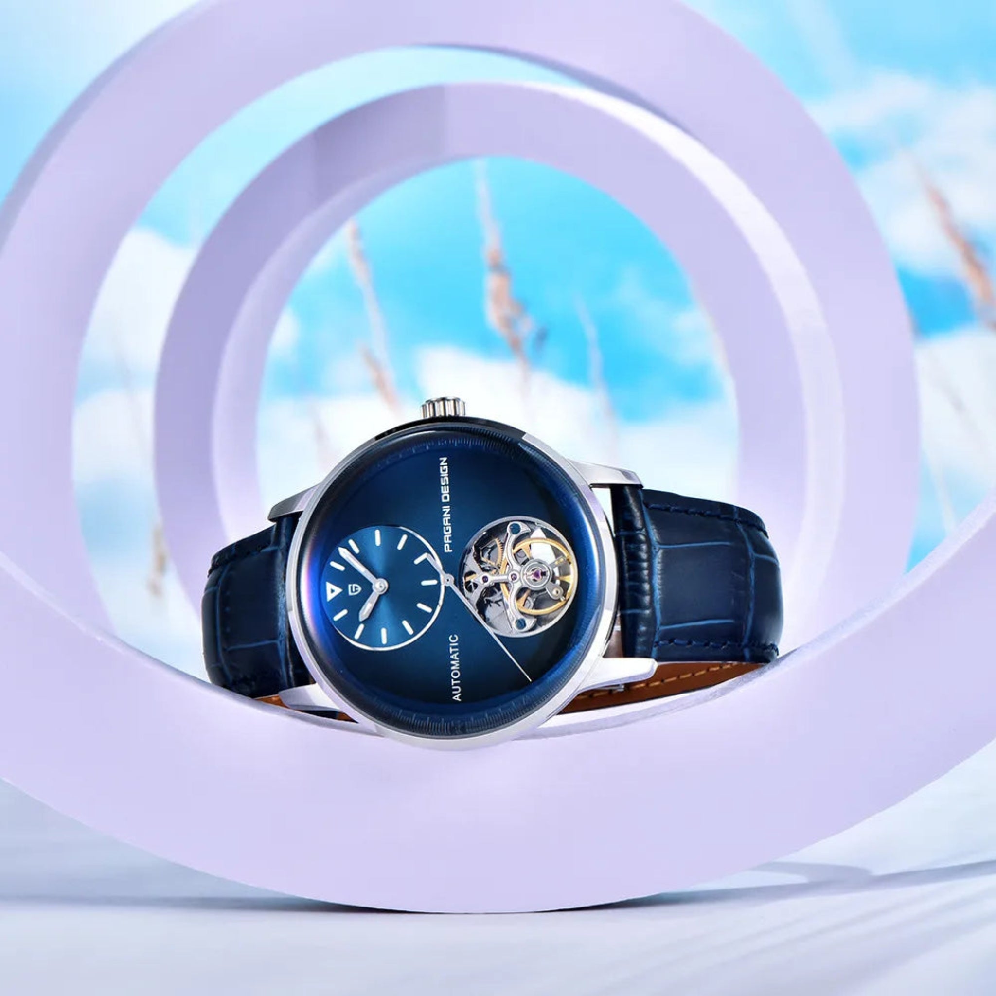 PAGANI DESIGN PD-1796 blends modern luxury with mechanical precision. This 42mm automatic men’s watch features a striking open-heart tourbillon design, multi time zone sub-dial, and luminous hands for clear night visibility. Crafted with a polished stainless steel case and premium leather strap, it delivers comfort, elegance, and reliable performance no battery required. A perfect statement watch for business, formal wear, or an unforgettable gift.