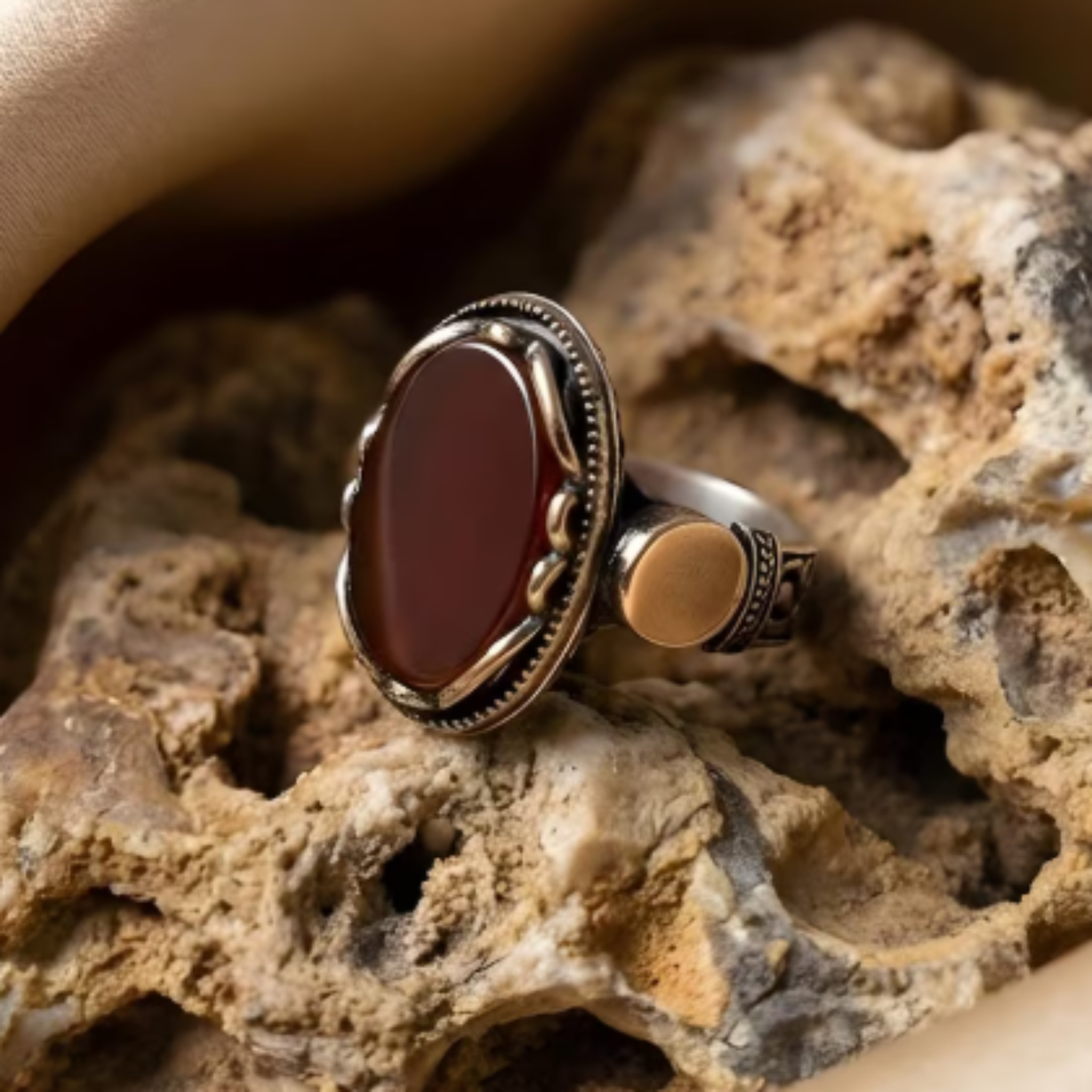 Add a touch of vintage charm and natural beauty to your jewellery collection with this stunning oval gemstone statement ring. Featuring a beautifully polished oval stone set in an intricate silver-tone band, this ring blends classic craftsmanship with modern boho style.